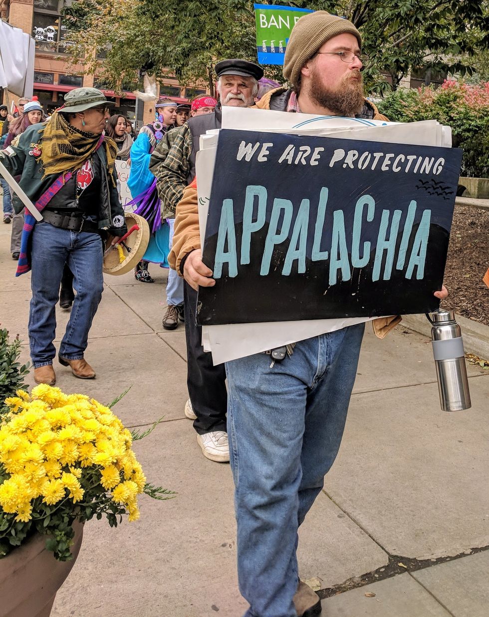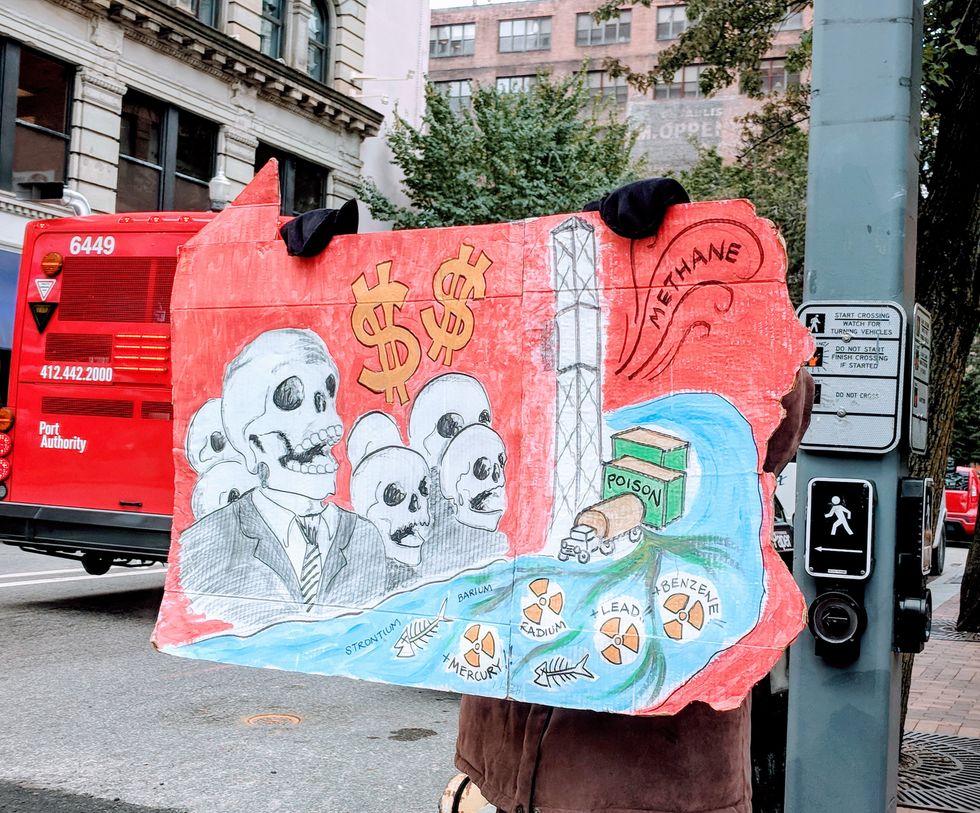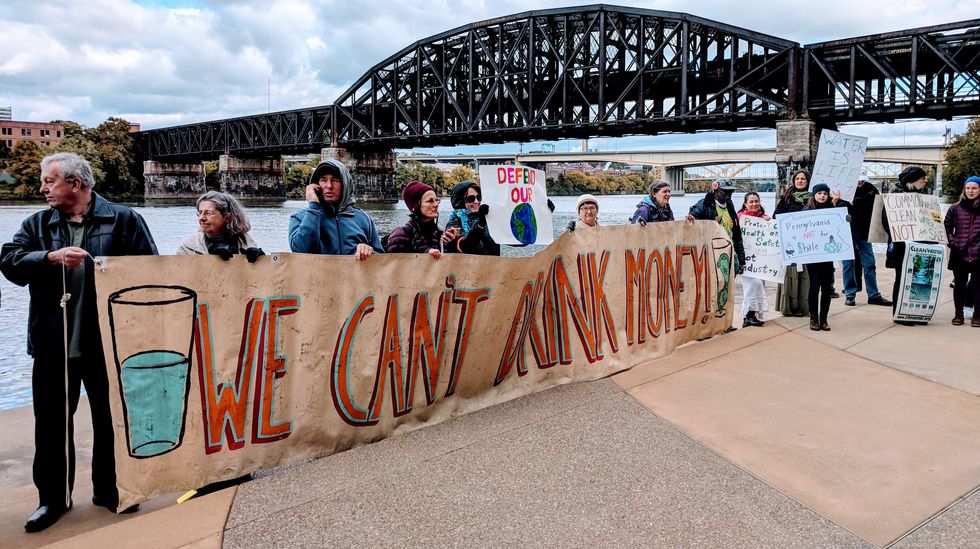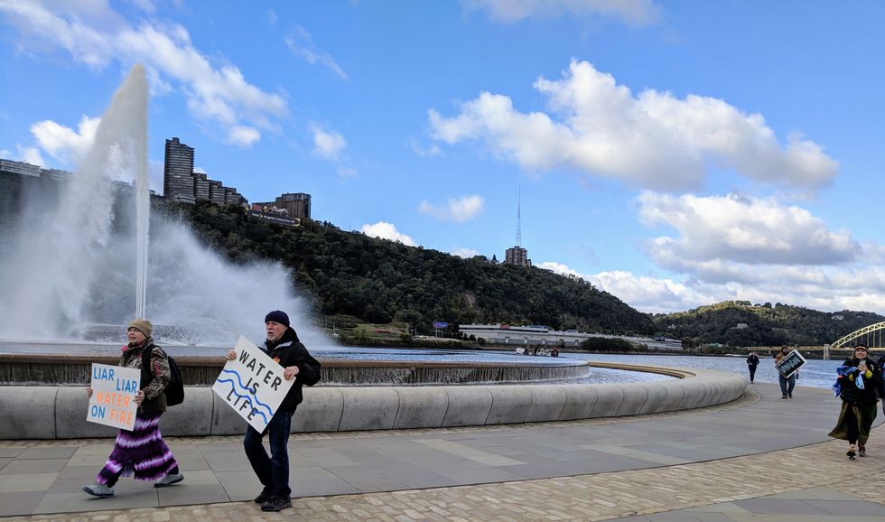 The march ended at the convention center, which sits directly alongside the Allegheny River. The crowd chanted, sang, and danced to protest the continued expansion of the natural oil and gas industry in the region and the associated threats to the region's water and human health.