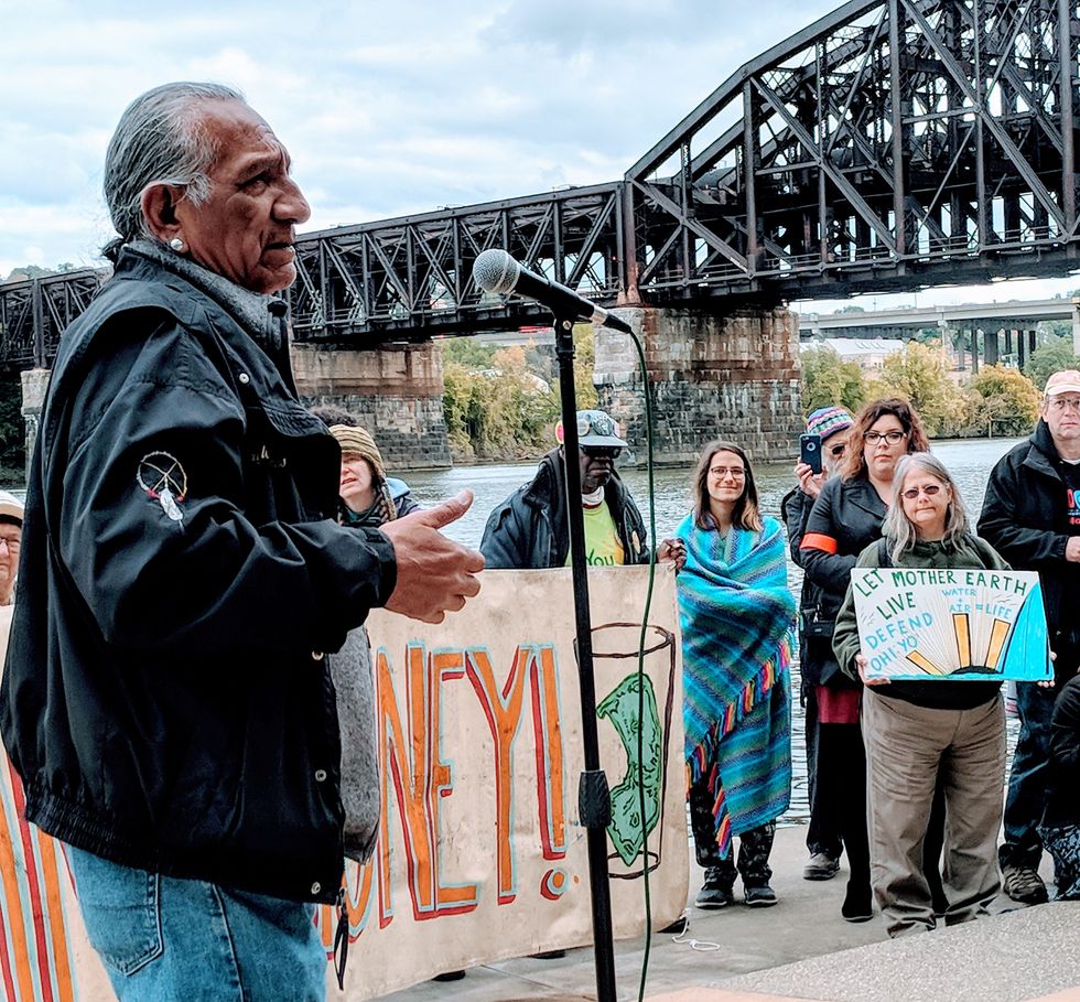 PITTSBURGH—Just after 10 a.m. today, Degawenodas, a water protector of the Wolf Clan of the Seneca Nation stood facing the place where the Ohio, Monongahela, and Allegheny rivers converge, and let out three sharp cries as a coal barge drifted beneath one of the city's iconic bridges.