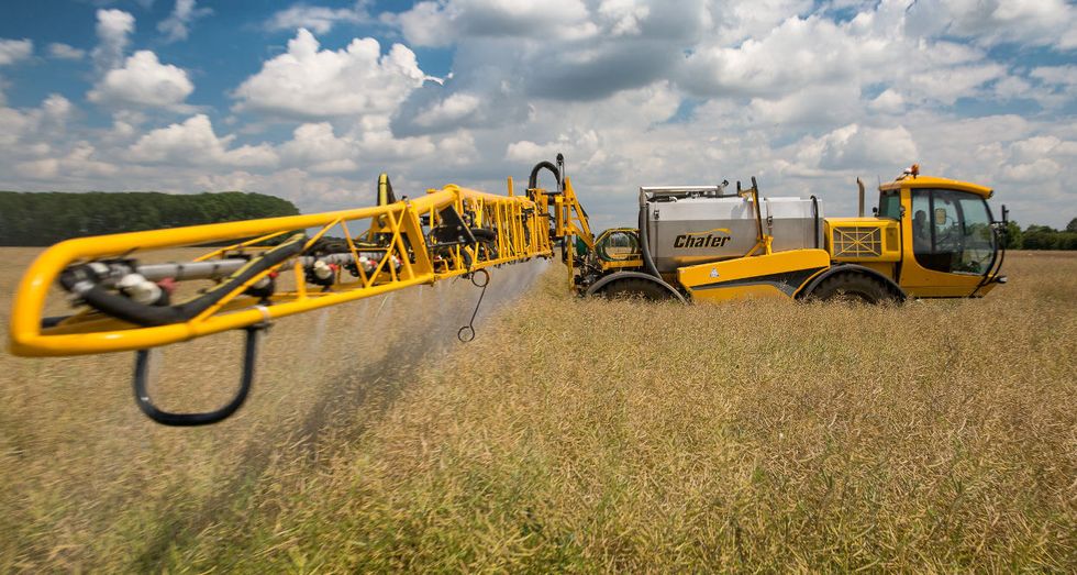 Glyphosate being sprayed. About 280 million pounds of glyphosate are sprayed each year in the U.S. (Credit: Chafer Machinery/flickr)