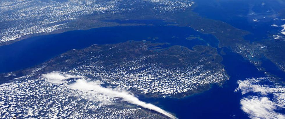 Aerial photo showing both lakes Michigan and Huron. (Credit: Stuart Rankin/flickr)