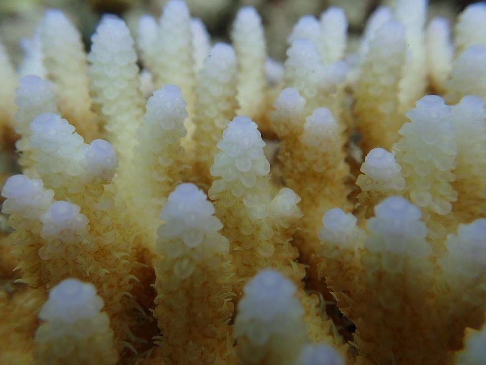 A close up of coral with pale tentacles after bleaching. (Credit: Stephen Palumbi)
