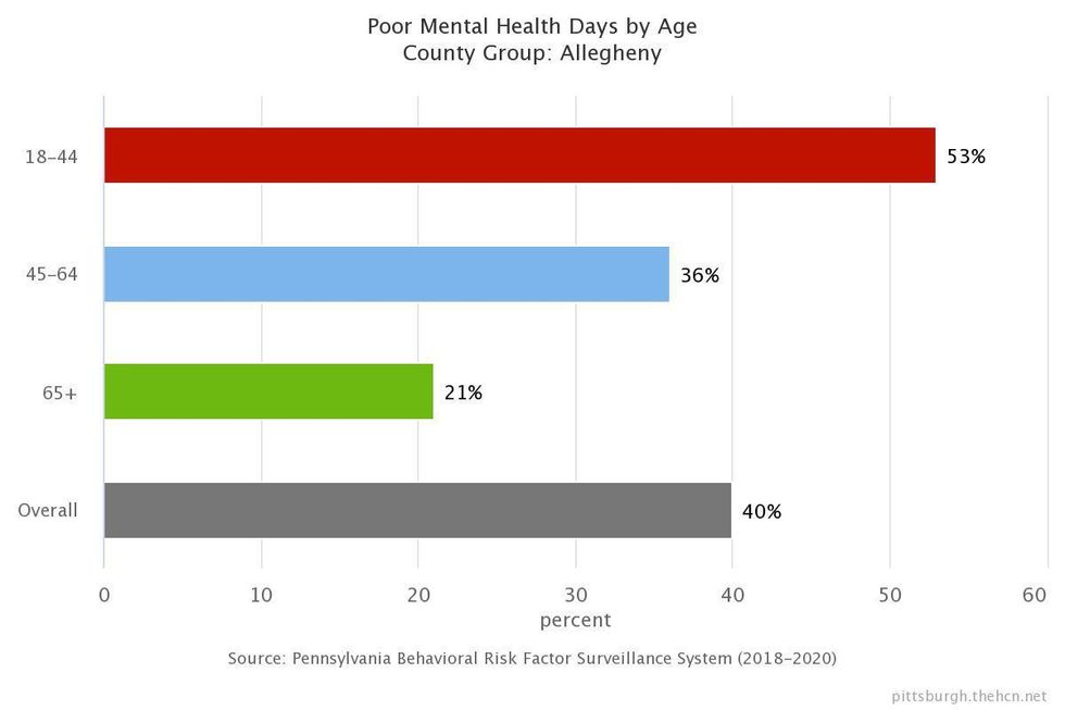 From 2018-2020, 40% of adults in Allegheny County reported having one or more days where their mental health was "not good," according to state data. That figure was even higher—53%—among 18-44 year olds. These figures were higher in Allegheny County than in half of other Pennsylvania counties, and slightly higher than state averages.