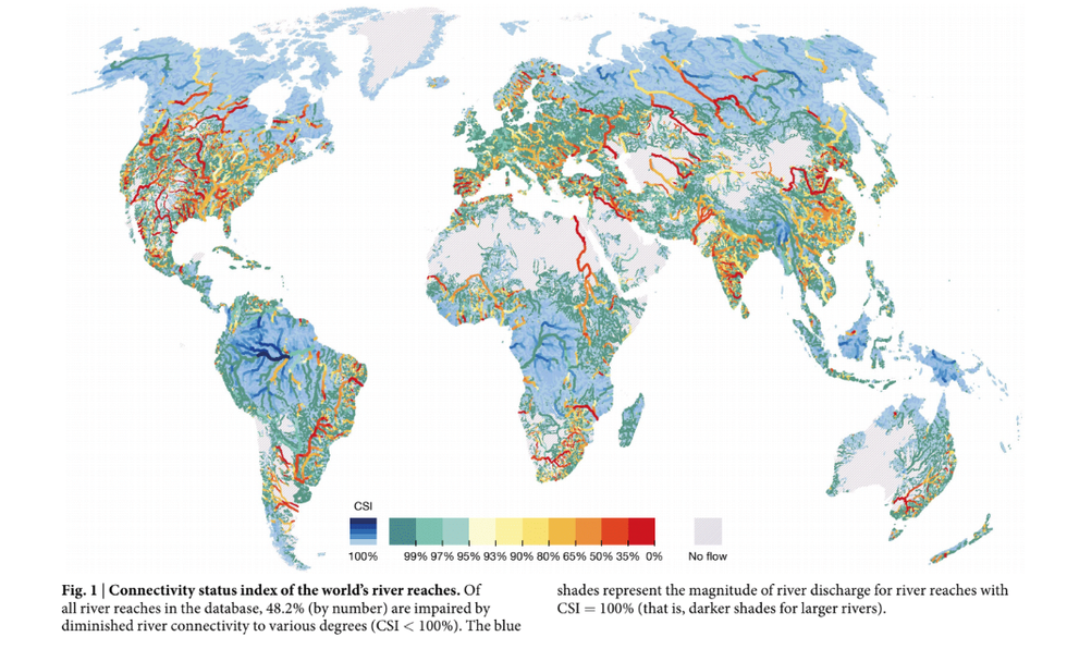 Dams and reservoirs are the leading cause for connectivity loss, the authors write, estimating there are approximately 60,000 large dams worldwide, and more than 3,700 hydropower dams are planned or being built. "While hydropower inevitably has a role to play in the renewable energy landscape, well-planned wind and solar energy can be more viable options for rivers and the communities, cities, and biodiversity that rely on them," Thieme said.