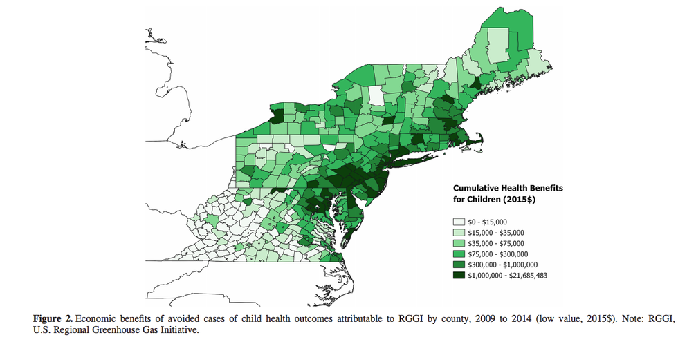 This isn't the first analysis to pin health benefits on the Regional Greenhouse Gas Initiative —in 2017, Abt Associates estimated that the total value of health benefits from the initiative from 2009 to 2014 were between $3 billion and $8.3 billion, with roughly 300 to 830 avoided premature adult deaths.