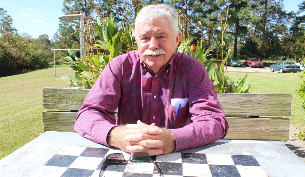 Martin Blaney, the head of the New Bern Housing Authority, at a table behind the senior housing complex where he waited out Hurricane Florence. (Credit: Lewis Raven Wallace)