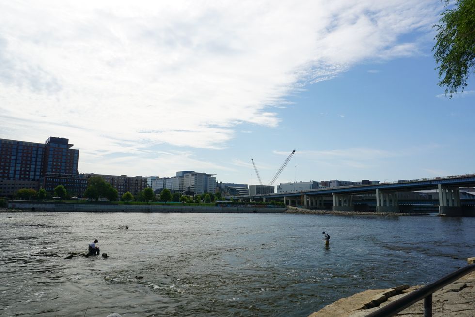 A bike ride out of town, along the river, includes a significant change in soundscape. Starting in downtown at the Sixth Street Dam, the river makes noise, but doesn't roar. Construction noise and traffic from two busy highways are most obvious.