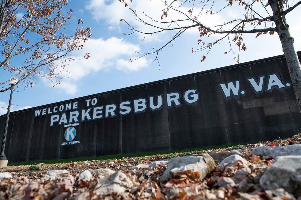 Weathered signage on the Point Park floodwall greets passersby in downtown Parkersburg, West Virginia, on Nov. 20, 2019. (Credit: Lexi Browning/100 Days in Appalachia)