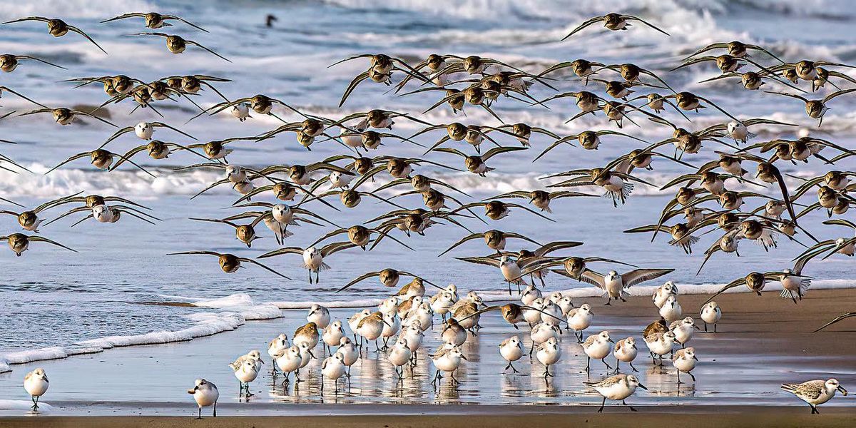 Banner photo: Mixed flock of sanderling and dunlin on Limantour Spit. The two sanderling in the very front are carrying sand crabs.