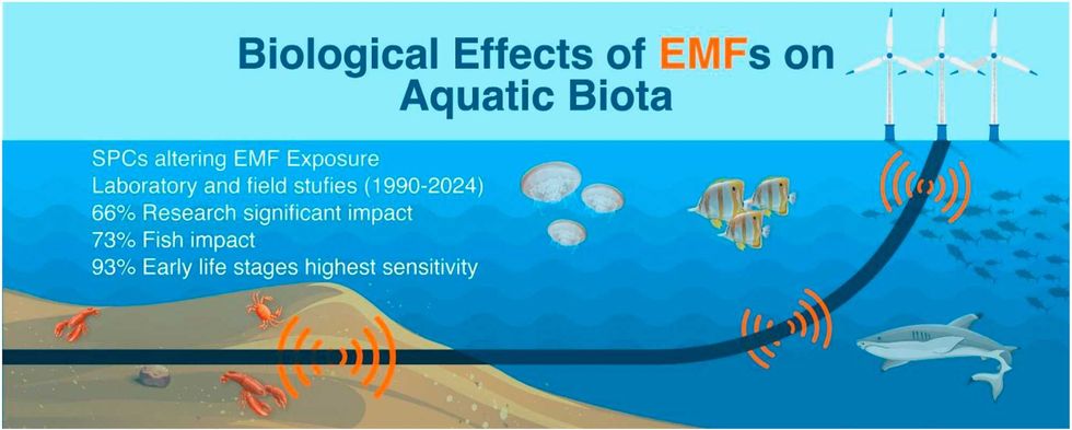 A recent systematic review published in Marine Environmental Research by Elizabeth James et al. examined 35 years of peer-reviewed studies on underwater electromagnetic (EMF) radiation exposure and found that 66% reported significant impacts on aquatic life.