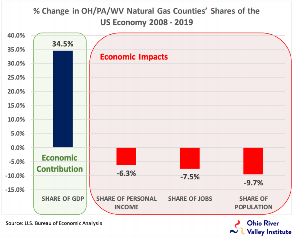 The study looked at the 22 counties in Ohio, Pennsylvania, and West Virginia that produce more than 90 percent of the region's natural gas. In 2008, those counties were responsible for $2.46 of every $1,000 of national economic output. By 2019, the counties were generating $3.31 of every $1,000 generated nationally—an increase more than triple the rate of national growth. But over the same period, those counties' share of the nation's personal income fell by 6.3 percent, their share of jobs fell by 7.5 percent, and their share of the nation's population fell by 9.7 percent.