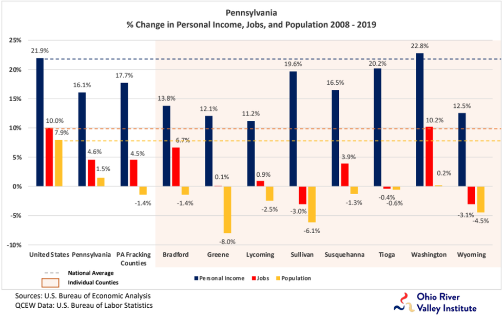 "This report documents that many Marcellus and Utica region fracking gas counties typically have lost both population and jobs from 2008 to 2019," John Hanger, former Pennsylvania secretary of Environmental Protection and policy director to Governor Tom Wolf, said in a statement. "This report explodes in a fireball of numbers the claims that the gas industry would bring prosperity to Pennsylvania, Ohio or West Virginia. These are stubborn facts that indicate gas drilling has done the opposite in most of the top drilling counties."
