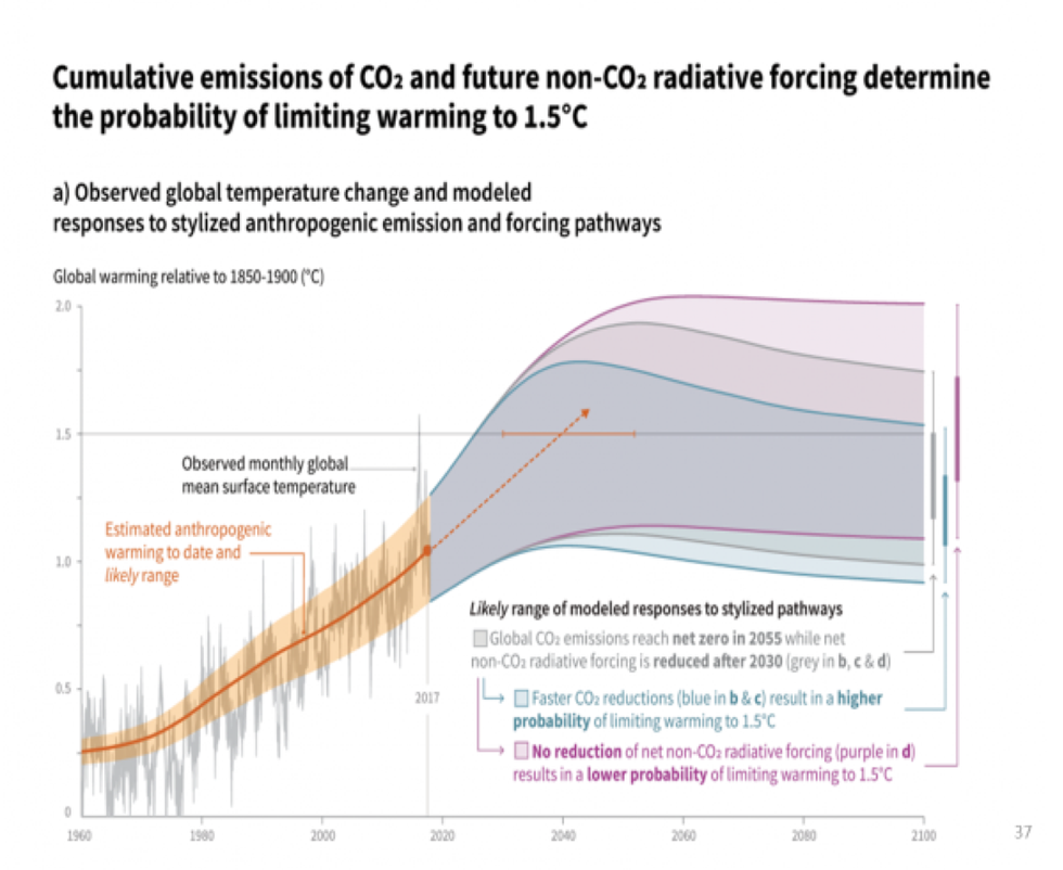 The most under-appreciated aspect of the IPCC's January 2019 Report on Global Warming of 1.5C is that even if all emissions decline according to the IPCC's optimistic timeline, global warming will not be limited to 1.5 degrees C. On the contrary, the report projects that Earth's temperature will likely rise well above 1.5 degrees C and remain there for several decades as it slowly declines to 1.5 degrees C by 2100.