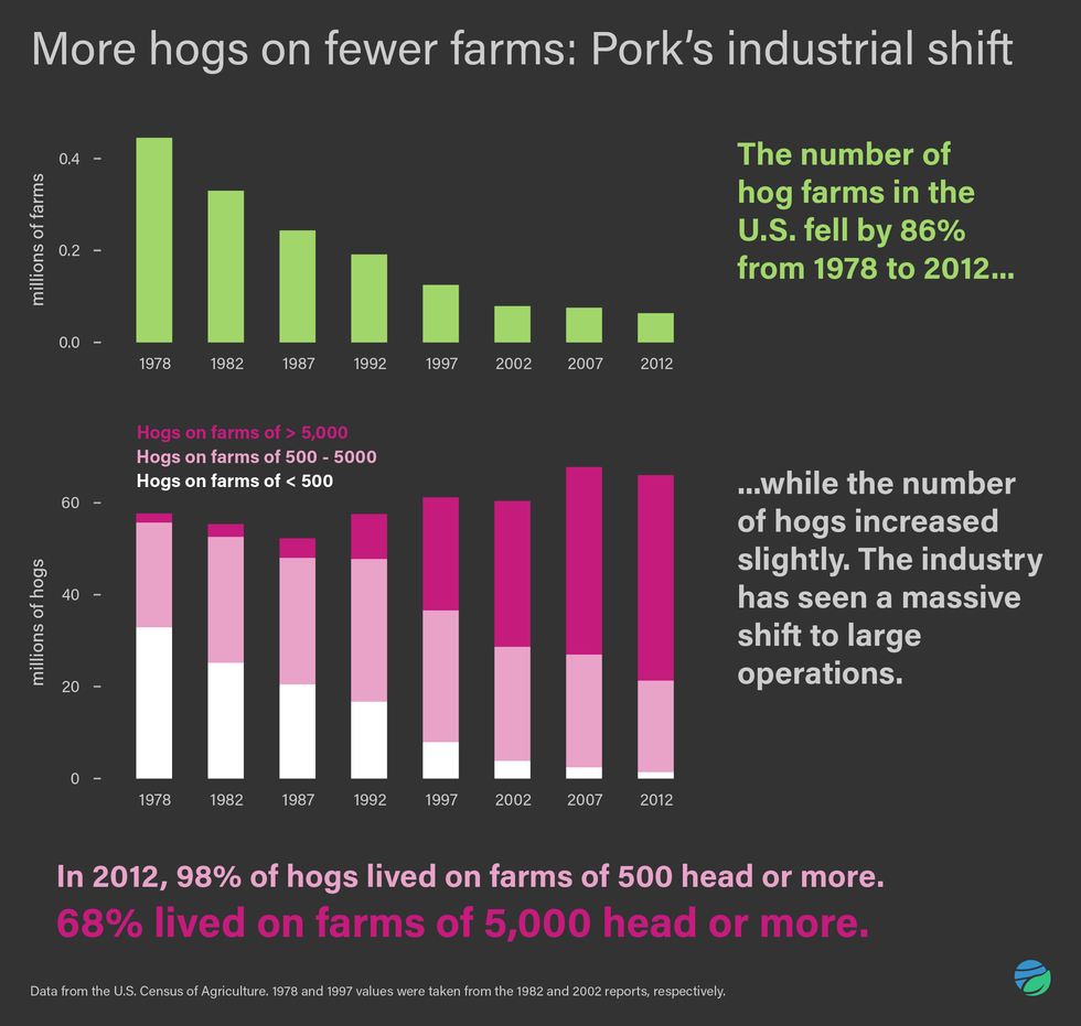 In every metric Iowa presents the poster child of hog farm consolidation and growth. Last year Iowa smashed a record—the state reached 22.4 million hogs, 7 percent higher than the year before and 30 percent higher than a decade ago, based on USDA data.