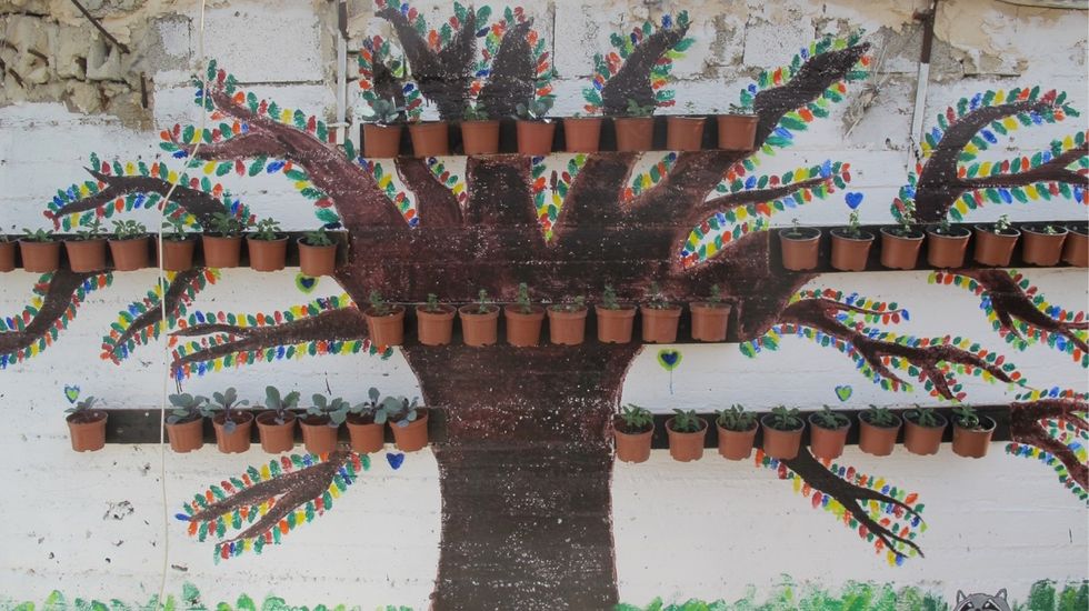 Mint, thyme, and sage grew in beds made of tires and palettes, and the barrels holding drinking water were painted with bright murals.