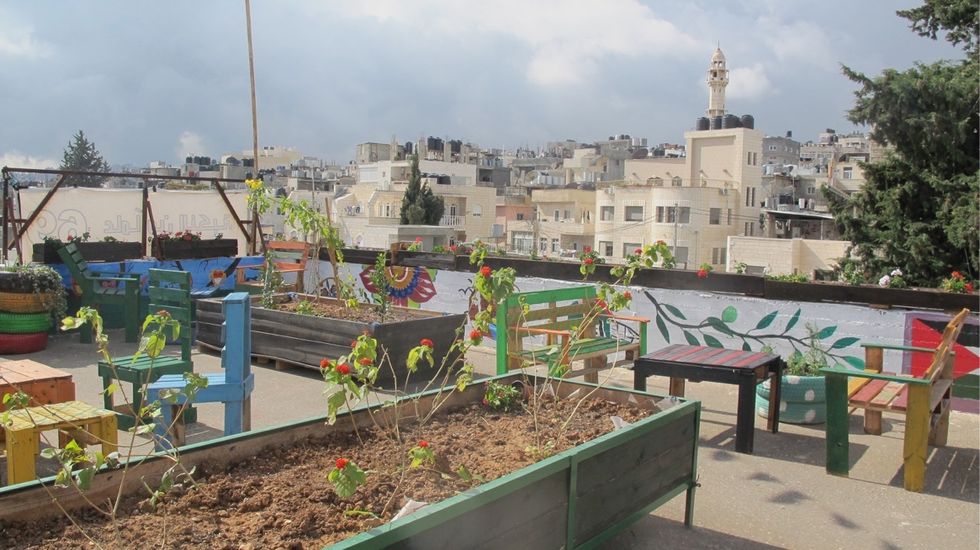 The rooftop garden at the Lajee Center looks out over Aida refugee camp, near Bethlehem in Palestine's West Bank. (Photo credit: Eyewitness Palestine)