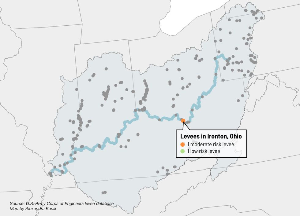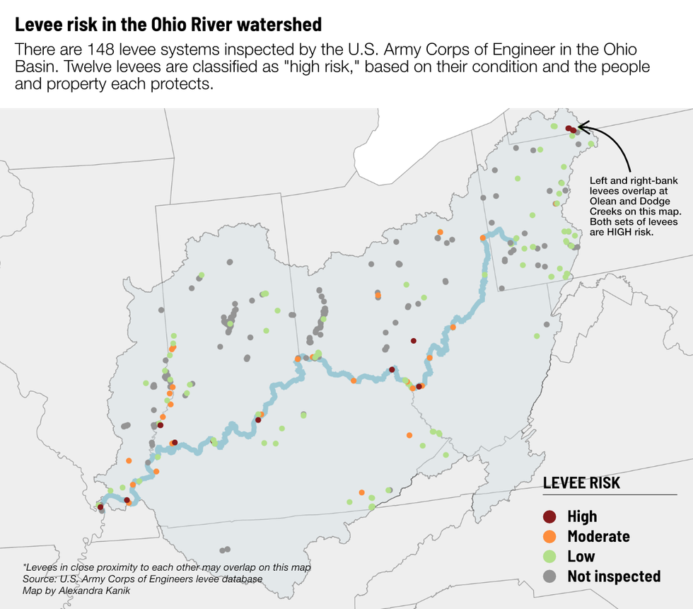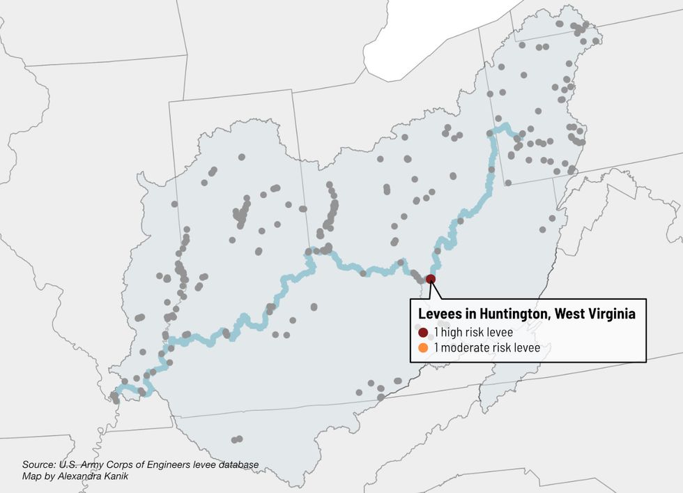 Twelve levee systems in the Ohio River basin have a "high" risk classification, including in Huntington, Louisville and systems protecting cities as small as Brookport, Illinois. This classification calls on officials to increase the "frequency of levee monitoring" and ensure the "community is aware of flood warning and evacuation procedures."
