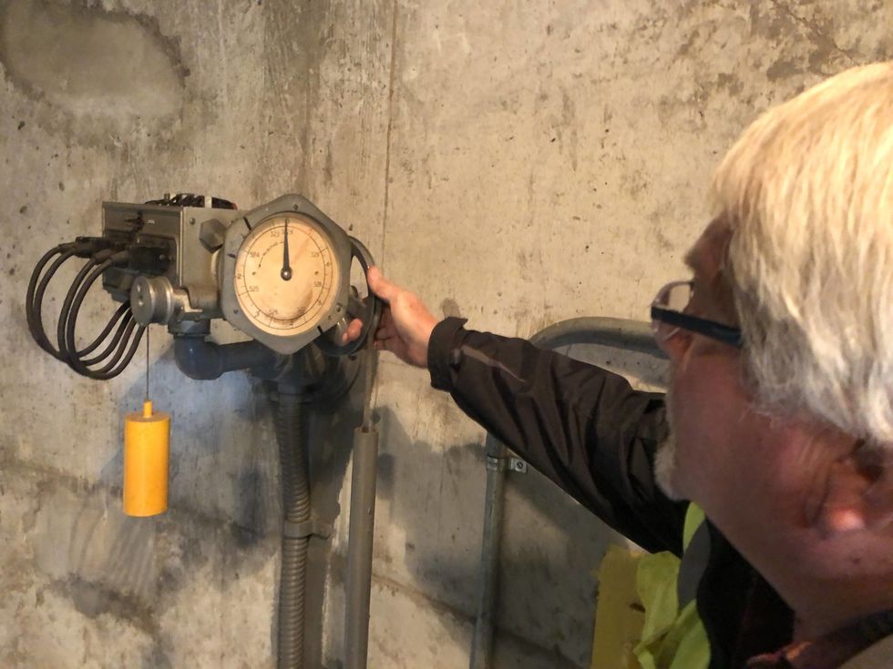 Pemberton motions to a sensor with a weighted pulley that uses mercury to tell how much water is being pumped during high water; modern equipment, on the other hand, would be computerized. He said it's fairly reliable, but sometimes the mercury container collects a film of carbon material that he shakes off.