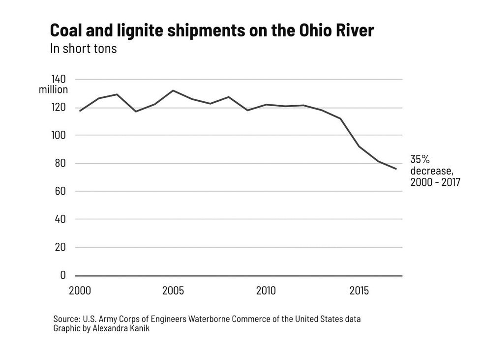 Just before dawn in January 2018, 27 barges were floating like a net along the banks of the Ohio River, downstream of the city of Pittsburgh.