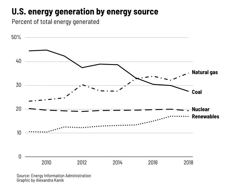 This trend follows the decline of coal and the increase in natural gas production in this region. Less coal is being mined as more companies go bankrupt and coal becomes harder to extract. Power plants are retiring coal generators in favor of natural gas units, which are not only cheaper but cleaner.