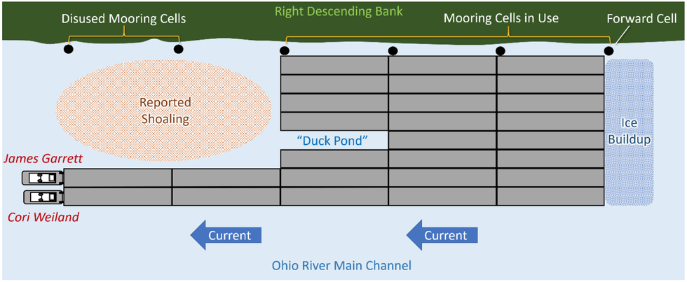 Barge arrangement at the fleeting area upstream from the Emsworth Locks and Dam prior to the Jan. 13, 2018 breakaway. (Illustration from NTSB accident report)