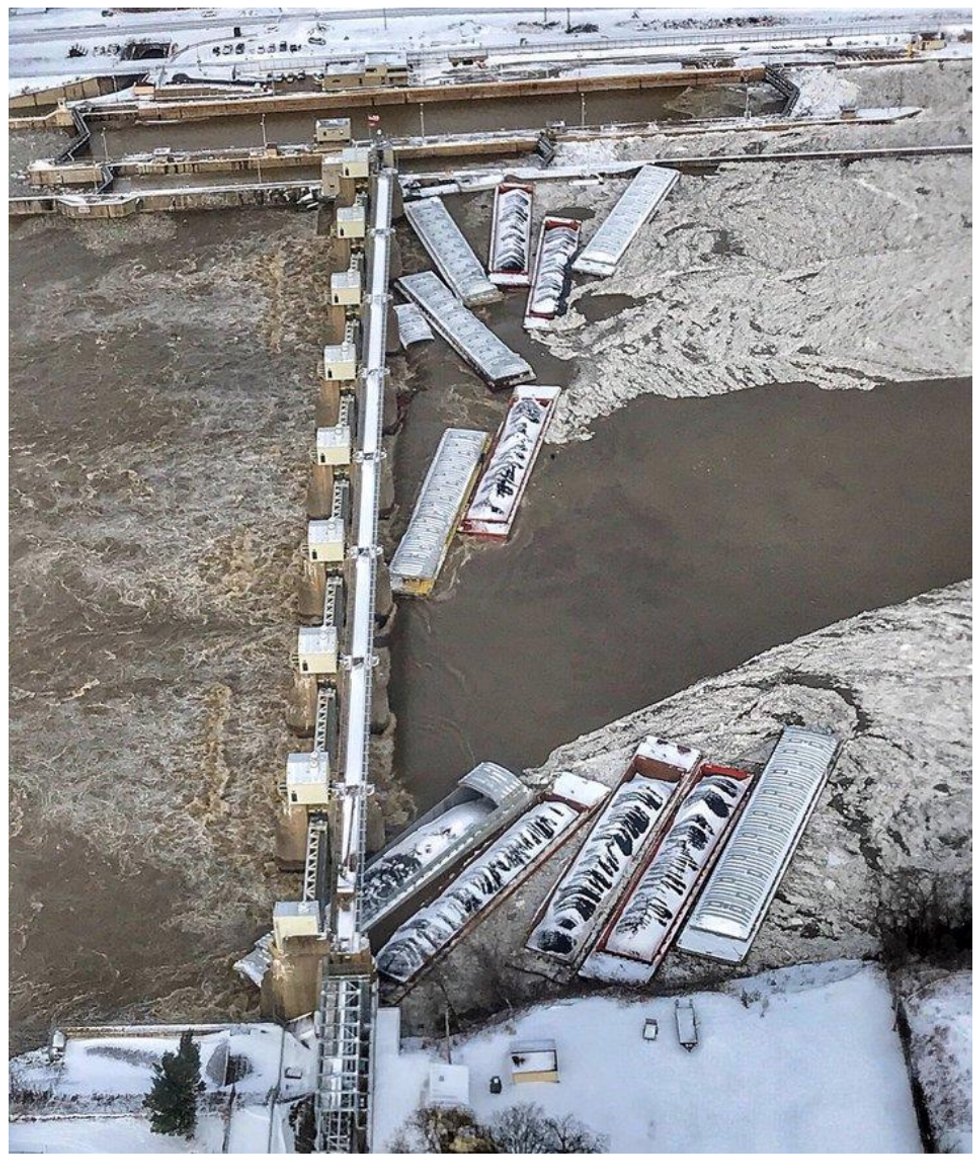 His vessel and all of the 27 barges began drifting downstream, propelled by the fast current and extreme weight of ice. Unable to control the barges, the towing vessels saved two and let the rest go.