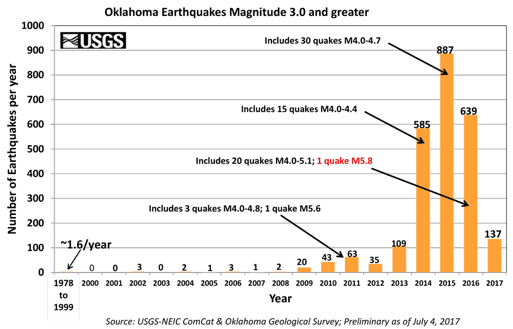 Oklahoma had some seismic activity prior to 2008, with one or two earthquakes (magnitude 3 or higher) a year. But that jumped in 2009, going from two in 2008 to 20 in 2009. In 2015, Oklahoma experienced 887 magnitude 3 or higher earthquakes, according to the U.S. Geological Survey.