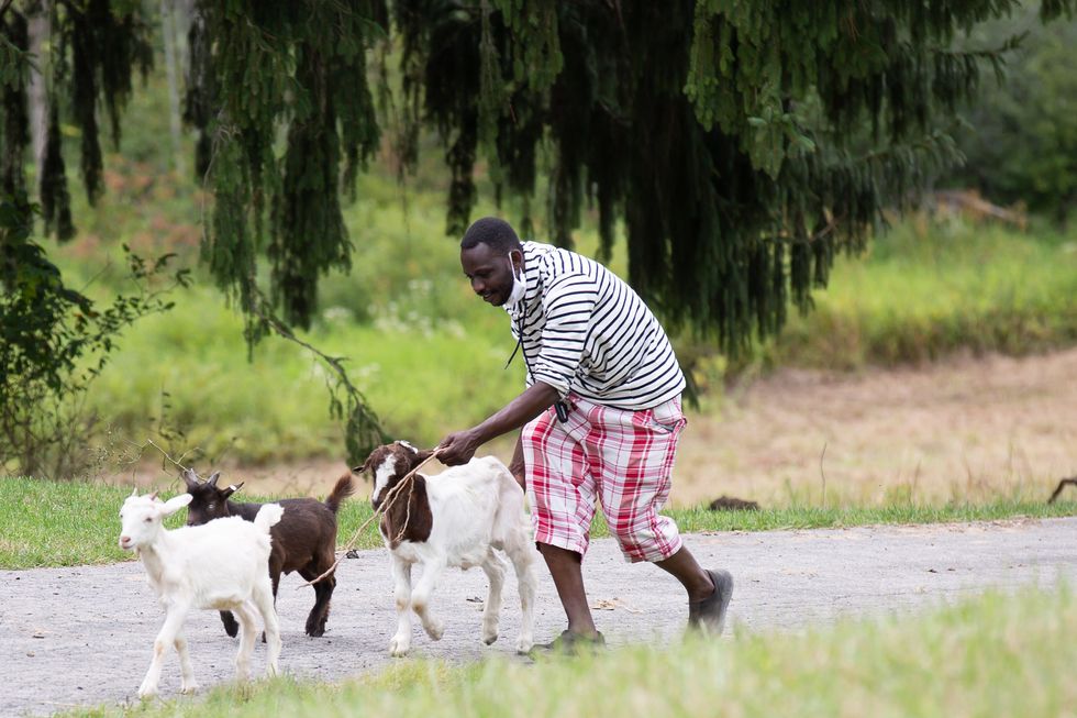Abdulkadir Chirambo leads baby goats across a cobblestone driveway at his Mwanakuche Farm in Mercer County. There are currently 35 sheep and 4 goats on the 13.5 acre property. (Credit: Brian Cook)