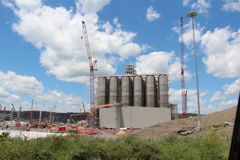 These tanks, shown here in June 2019, will hold the plastic pellets produced by Shell's ethane cracker. According to Shell, 1.6 million metric tons of plastic will be produced there annually. (Credit: Reid Frazier/The Allegheny Front)