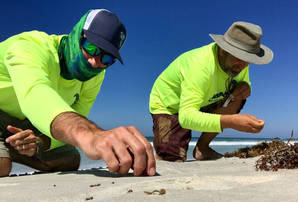 Jace Tunnell (left) and Sam Sugarek scour a beach in Texas in search of nurdles. The Nurdle Patrol protocol calls for documenting the number of nurdles found in 10 minutes of searching. (Photo: Jace Tunnell)