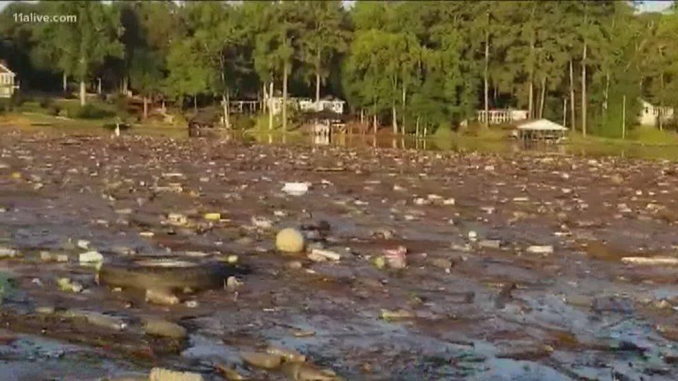 Trash floating in Lake Jackson, south of Atlanta, after a rain
