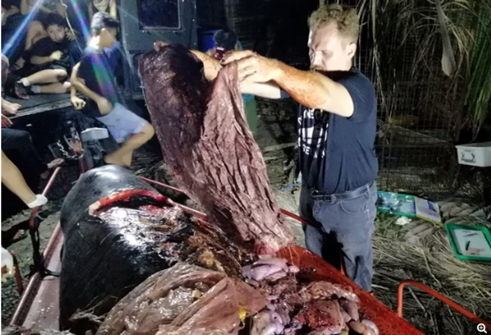 Darrell Blatchley, director of D'Bone Collector Museum Inc., pulls plastic waste from the stomach of a Cuvier's beaked whale that washed ashore in Compostela Valley, in the Philippines.