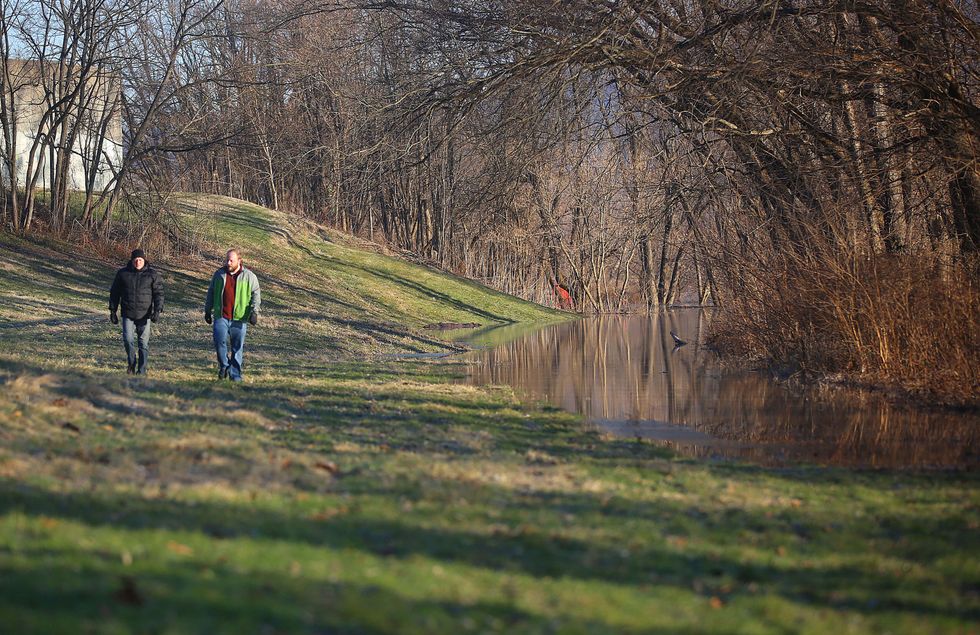 Chuck Keller (left), from Fort Thomas Kentucky, and Jeremy Shannon, from Southgate, Kentucky, walk near the Licking River Greenway and Trails next to the Licking River in Covington, Kentucky. In addition to point pollution sources, non-point pollution like grass fertilizer runs off into the river as well. (Credit: Leigh Taylor/Eye on Ohio)