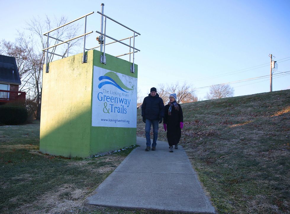 Chuck Keller and Debra Hausrath, both from Fort Thomas, Kentucky, walk along the Licking River Greenway and Trails in Covington, Kentucky, on Dec. 19, 2019. Nearby manufacturer IPSCO Tubulars discharges wastewater containing lead and manganese into the river. (Credit: Leigh Taylor/Eye on Ohio)