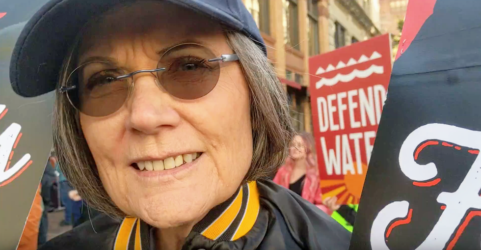 "We believe it's not a question of good jobs or the environment," Barbara White Stack, a 65-year-old member of the United Steelorker's Union (USW) who attended the protest, told EHN while a tribal leader sang a native prayer song over the loudspeaker at the front of the rally. "It's not one or the other. It has to be both. Workers and their families need a clean environment to survive."