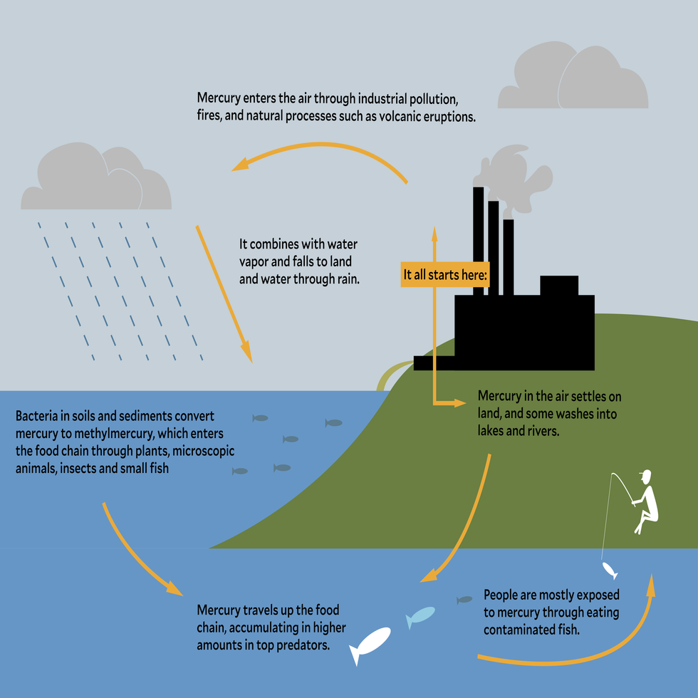 Mercury takes a complicated path from industrial and natural sources through water and air to humans
