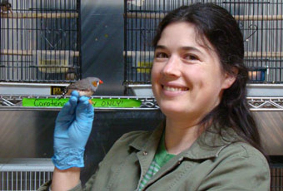 In a cage on the William and Mary campus, a male zebra finch is showing off. He puffs out his chest, opens his bright red beak and sings. It's a musical, fluid little song that stands out among the cheeps and squawks from other birds in cages stacked in the fluorescent-lit room. His mate hops down to the lower perch and he sings again. Then the two perch side-by-side on the edge of the food dish, pecking at the brightly colored, mercury-contaminated bird food.
