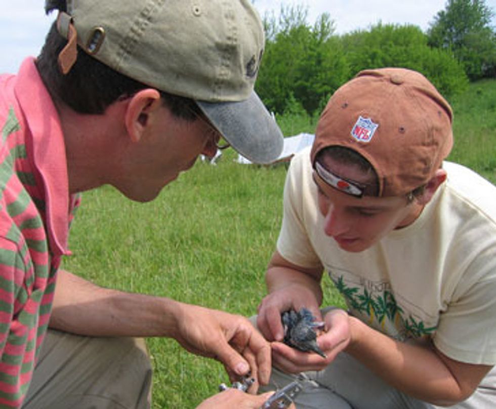 Most birds known to be harmed by mercury are fish eating seabirds or waterfowl. So Cristol set out to find out if mercury made birds have fewer chicks by studying three species of local birds that are closely connected to the aquatic food web: kingfishers, tree swallows and screech owls. Kingfishers nest in holes they dig into riverbanks, so Cristol and his students dug pits next to the nests, then carefully scooped their way in from the back to count eggs and young, and take blood and feather samples. For tree swallows and screech owls, they put up nest boxes. Other birds nested in the boxes, too, including bluebirds and wrens. "We sampled them just like everything else," Cristol said.